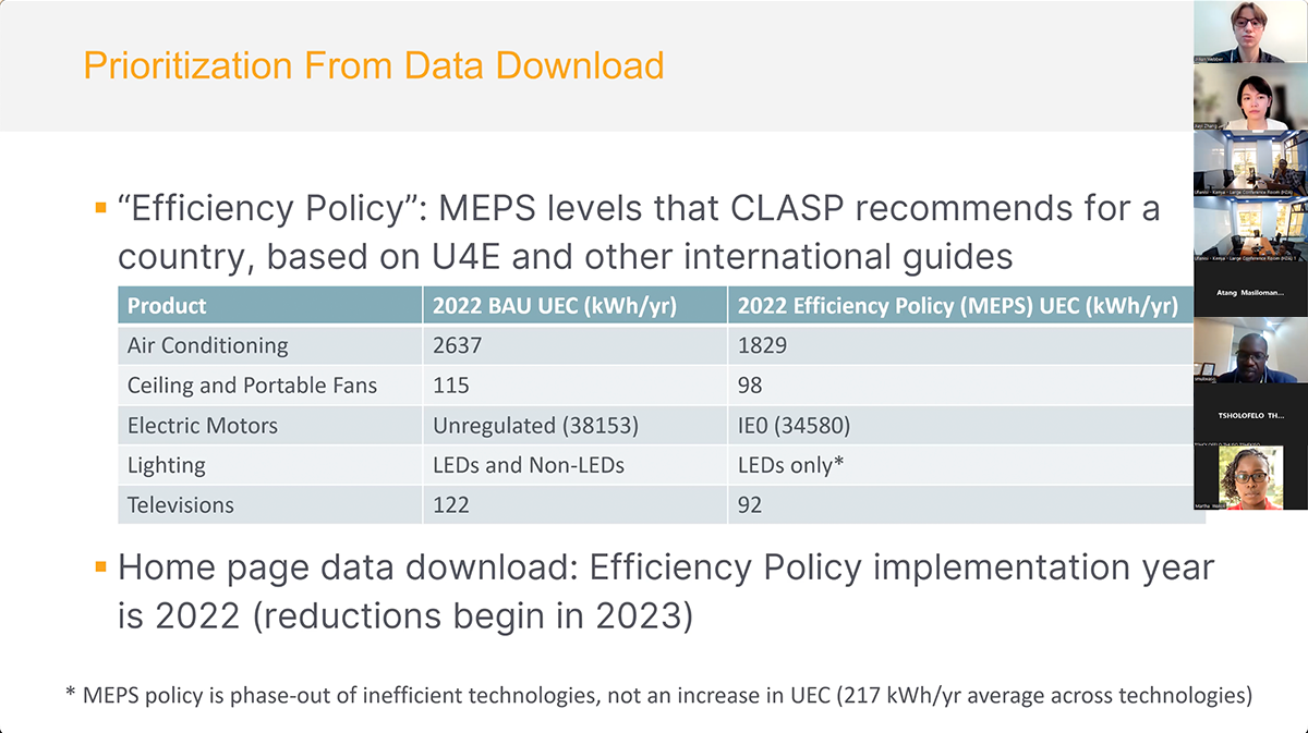 Members from the Botswana Department of Energy joined CLASP to learn how Mepsy can help with appliance policy prioritization and impact evaluation.