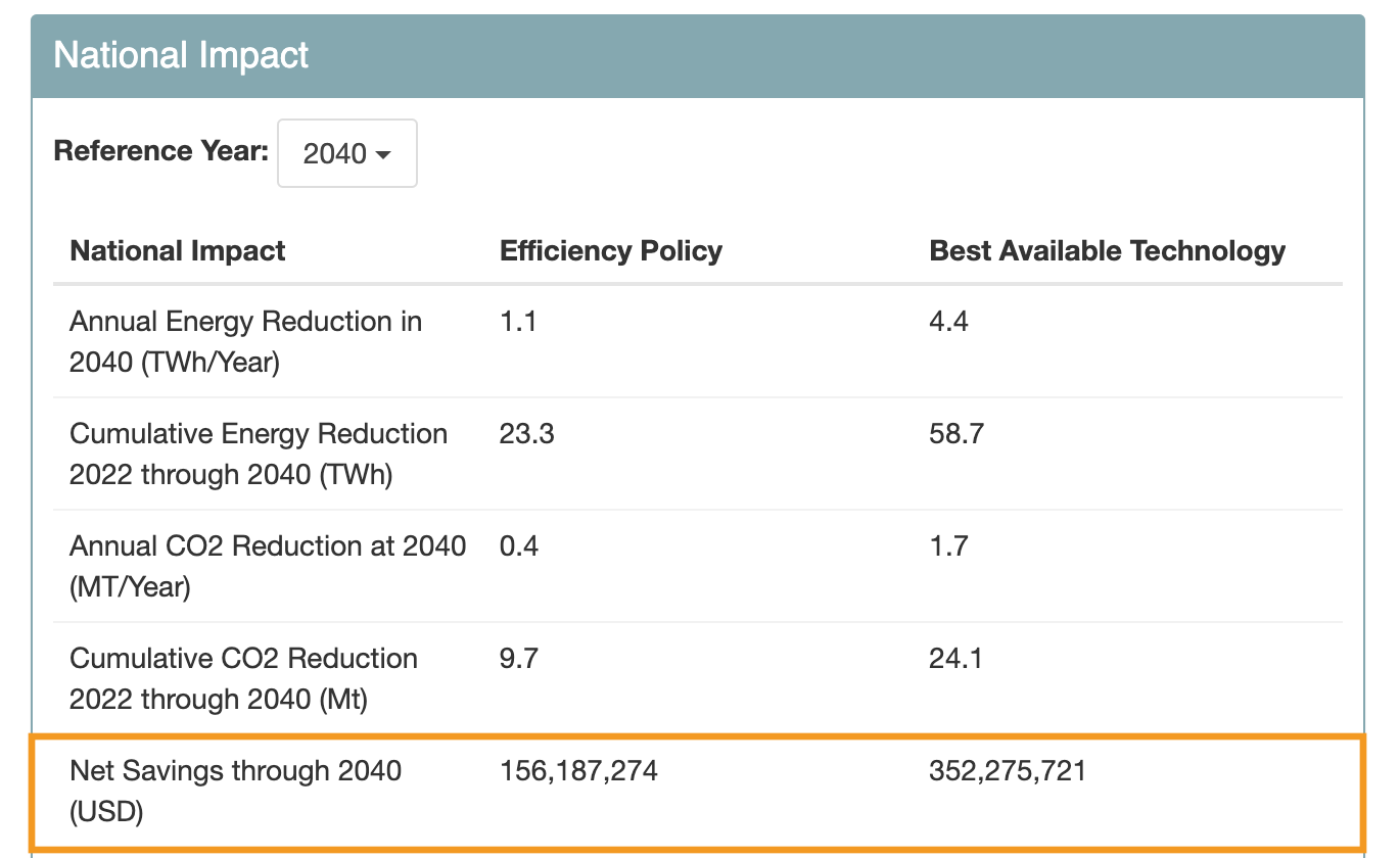 To illustrate the monetary gains from different levels of efficiency, Mepsy has added a “Net Savings” calculation under the “National Impact” section. This figure is a cumulative dollar amount through the selected “Reference Year” found by subtracting the investment needed to deploy new units from the national savings through energy reduction. Unit price can be adjusted in the Equipment Data parameter category.